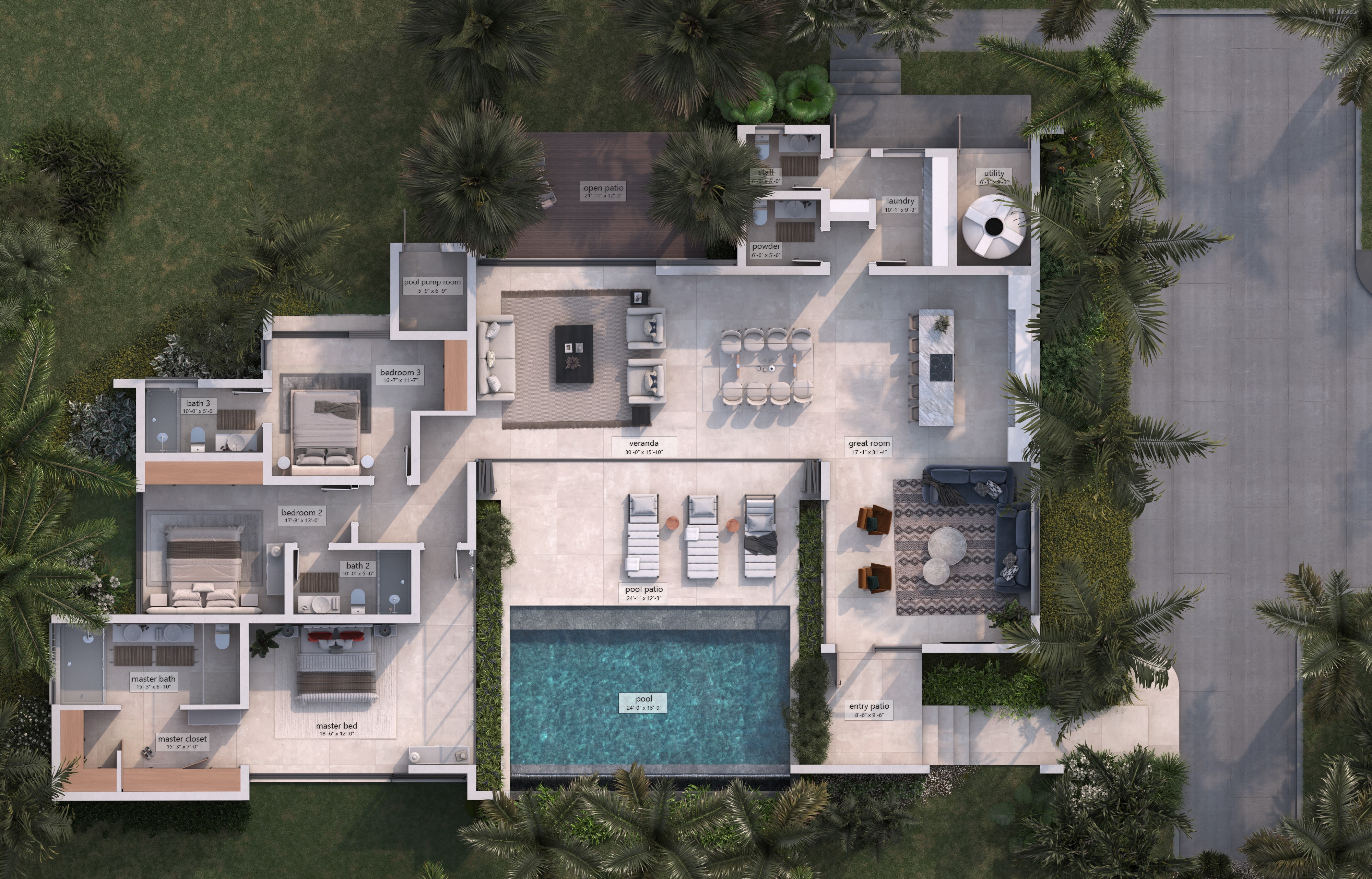 Anchored by a grand open-plan great room and a chef-grade kitchen, the home is designed for elevated tropical living. A shaded veranda leads to the sun-drenched pool terrace, where a 24’ x 15’-9” infinity-edge pool invites relaxation amidst tranquil garden views.