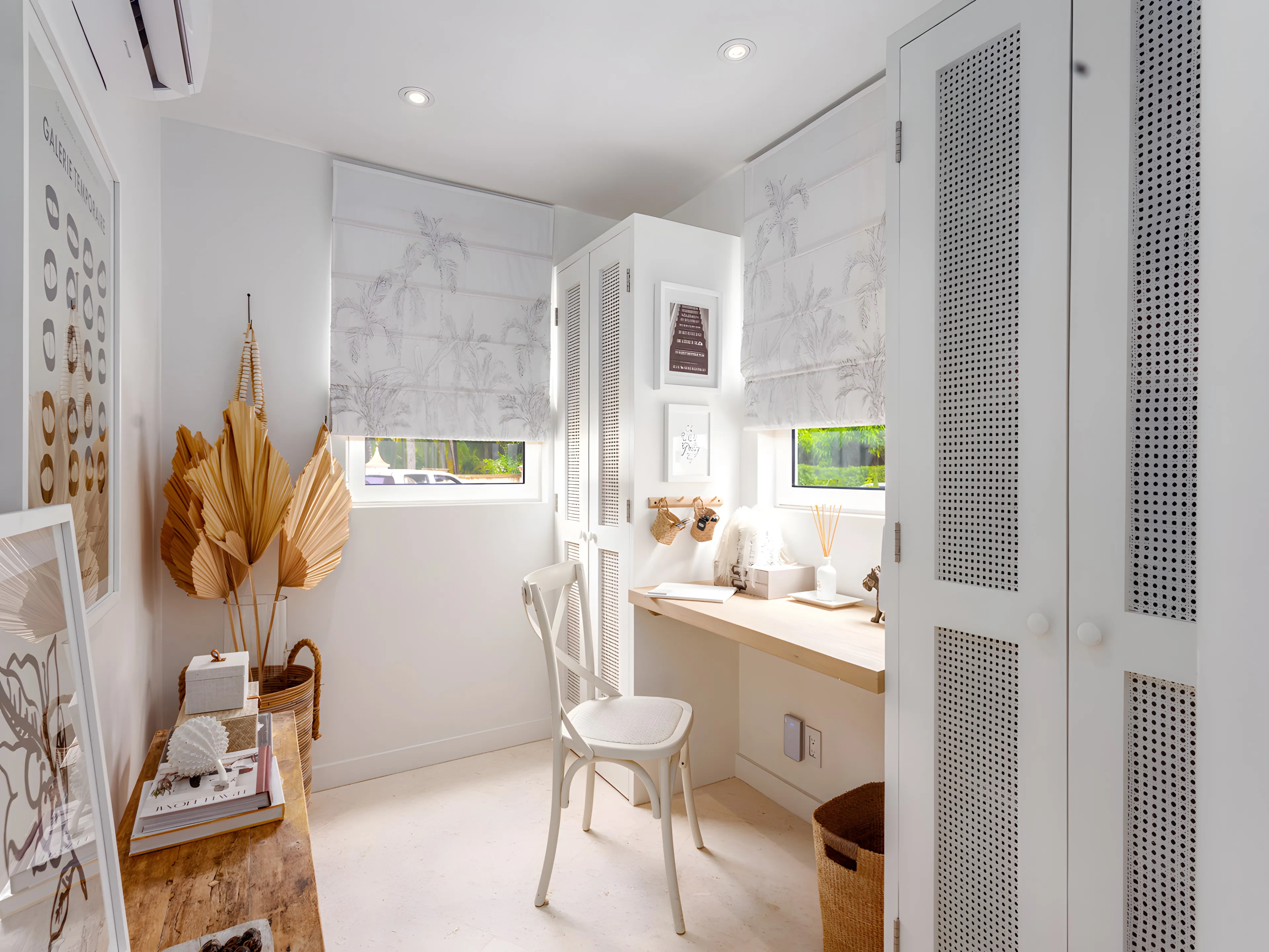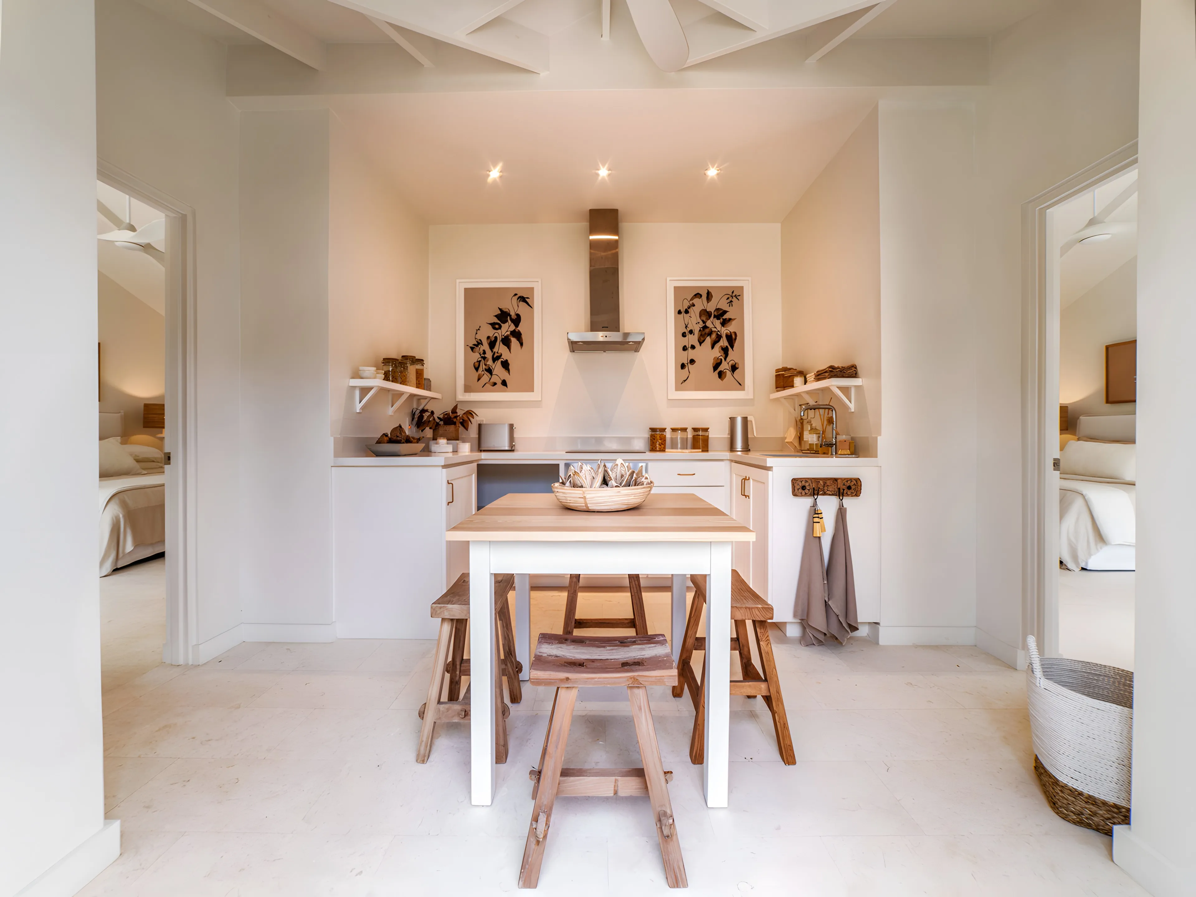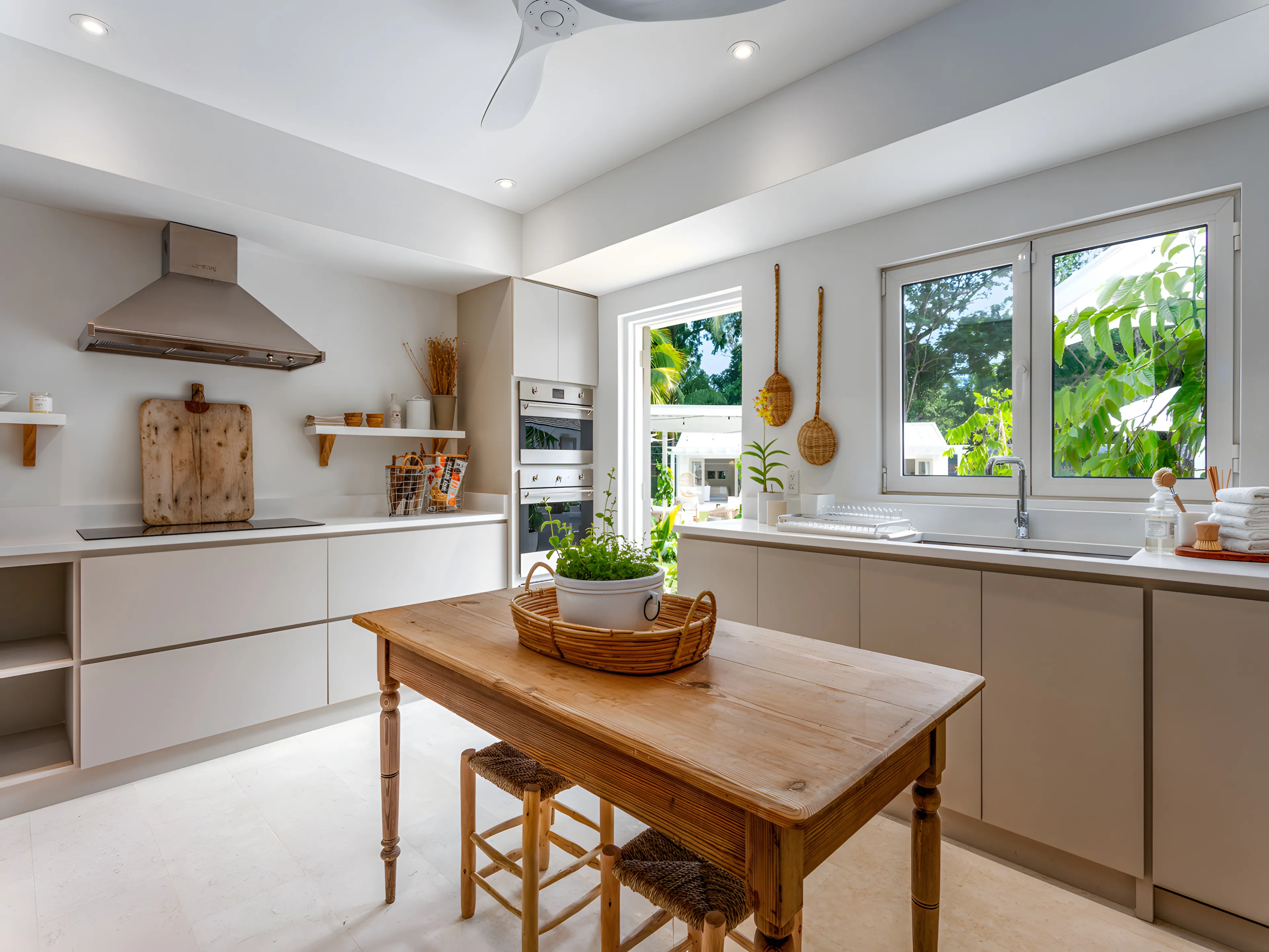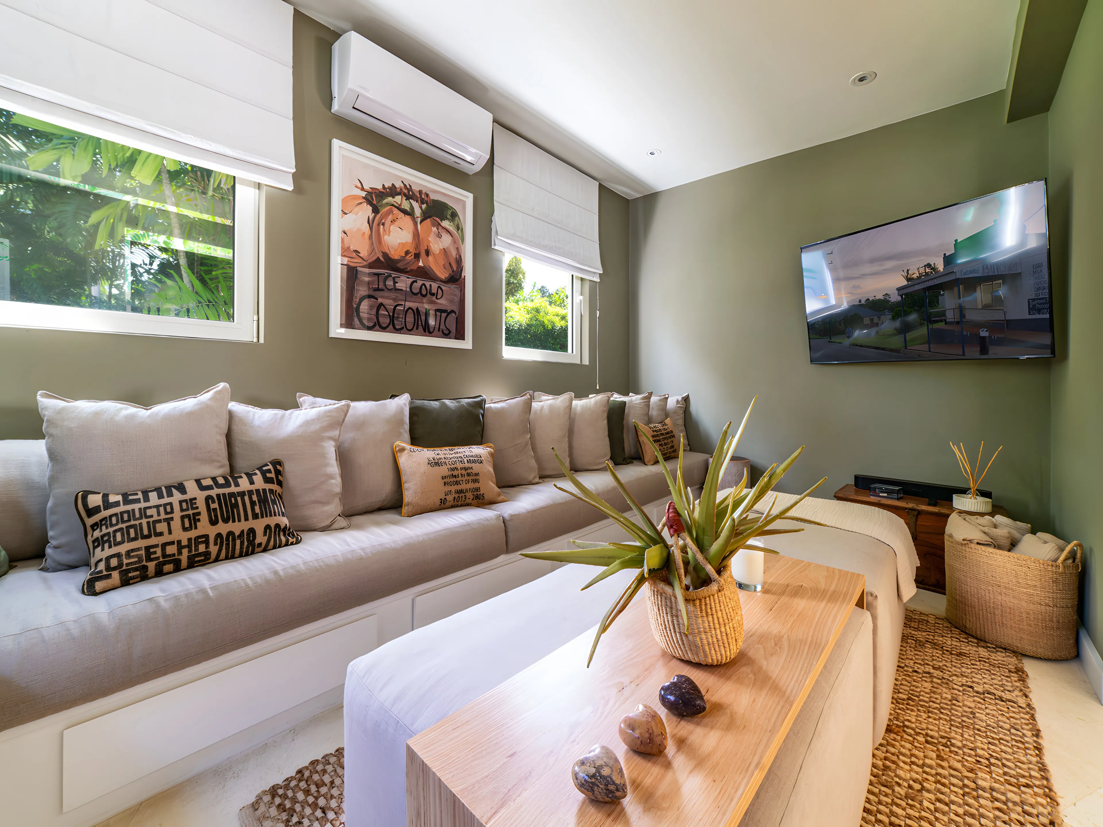 The main residence offers three generous en-suite bedrooms alongside light-filled living spaces designed for both everyday living and entertaining. The central living area opens onto a covered dining terrace, while a discreet media lounge and dedicated home office add flexibility and function. The designer kitchen features stainless steel appliances and bespoke cabinetry, flowing naturally to outdoor lounges and terraces that make the most of the tropical setting.