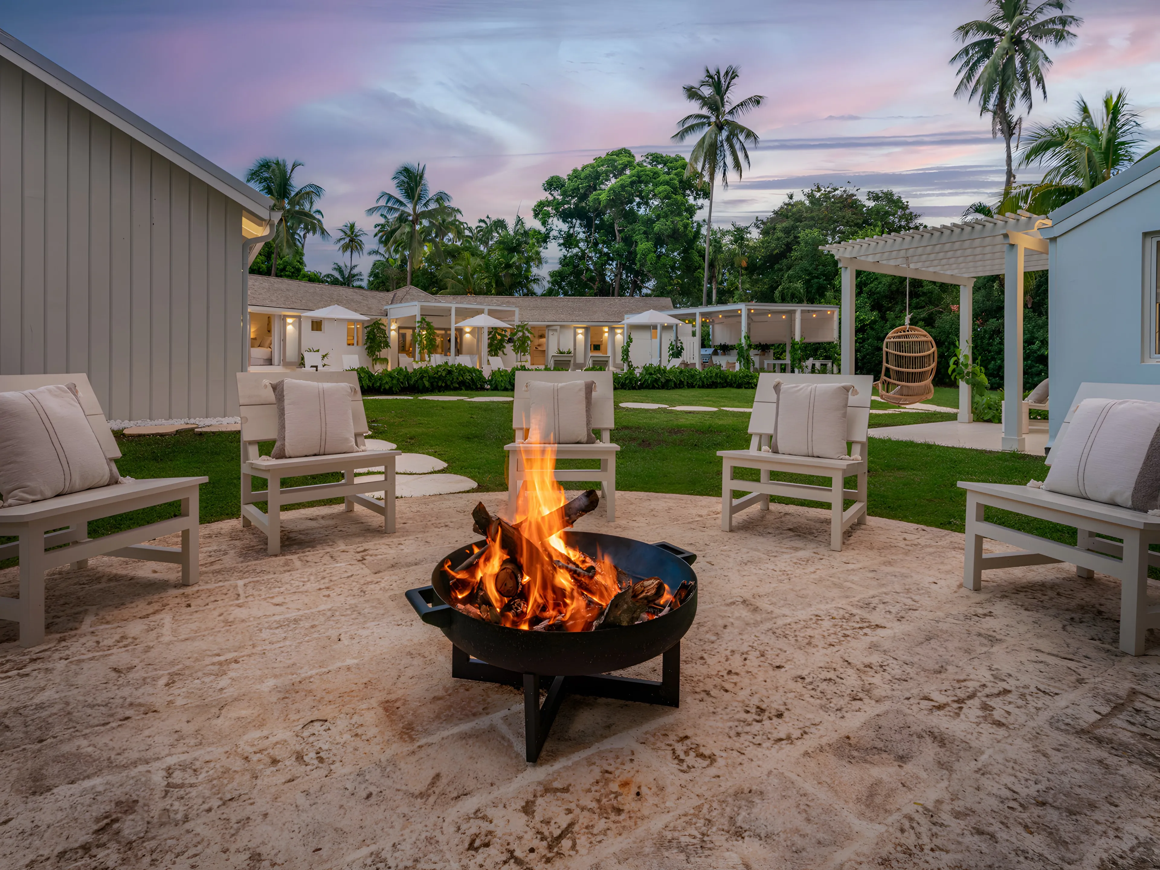 A separate guest cottage provides two additional en-suite bedrooms, each with a private terrace and kitchenette, making it ideal for visiting friends or extended family. At the heart of the property, a central courtyard wraps around a saltwater swimming pool, complemented by lush landscaped gardens, a firepit, and inviting outdoor dining areas that create a true sense of retreat.