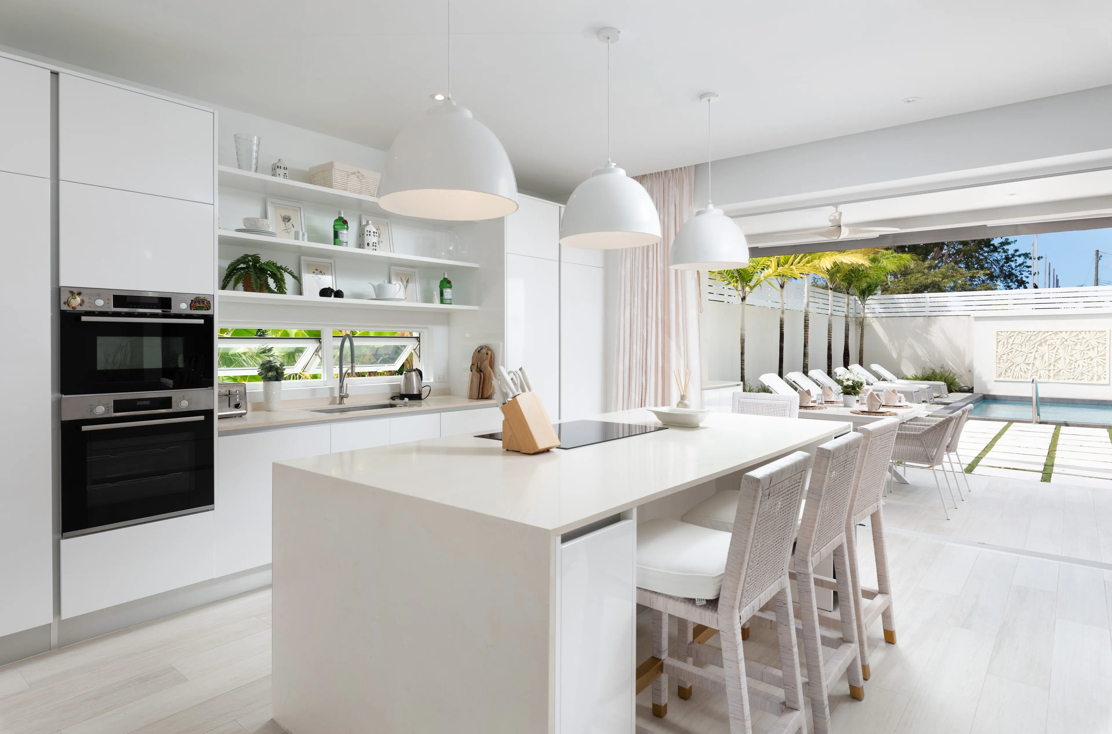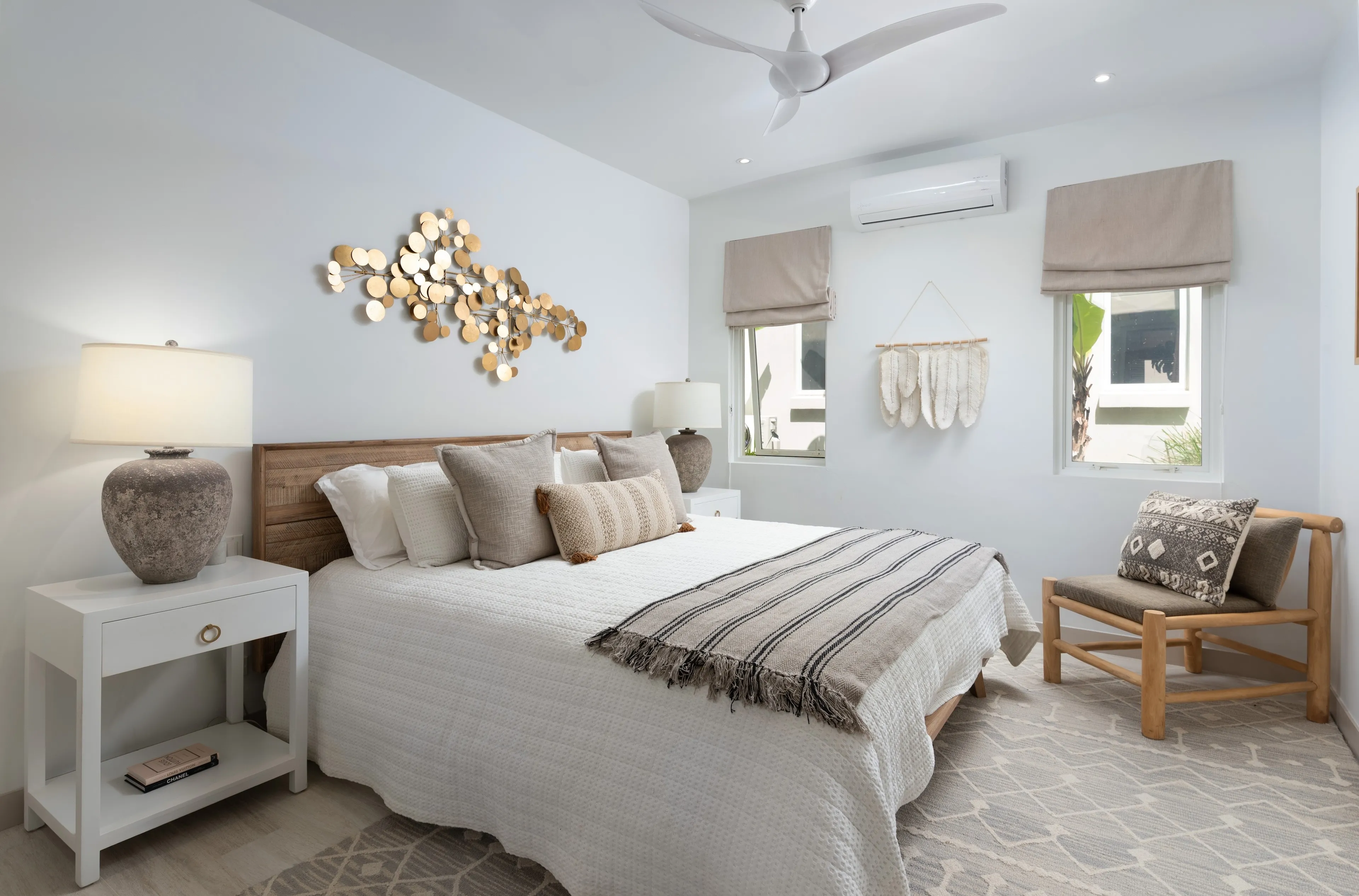 Inside, a stylish, modern kitchen with a central island and high-end finishes opens to a bright and breezy living area. Air conditioning runs throughout, and soft neutral tones, natural textures, and curated artwork create a relaxed, coastal feel.