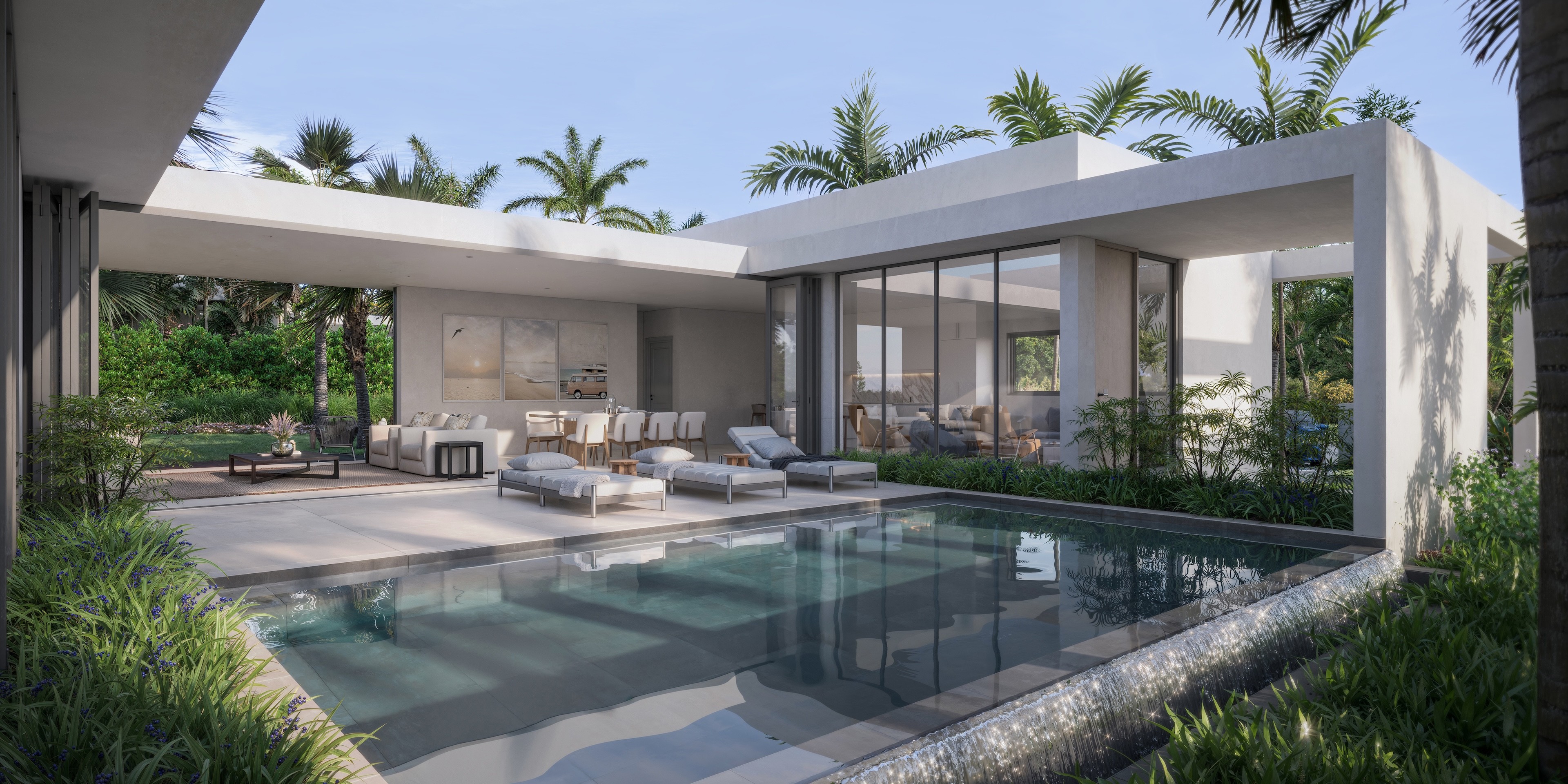 The master suite is a tranquil haven with custom wood paneling, elegant closets, and a dedicated vanity space. The en-suite bathroom is adorned with hand-cut white marble floors, hand-crafted bleached teak, dual vanities, and a spacious glass shower backed by natural limestone. Each guest bedroom includes a private balcony and en-suite bathroom, with distinct touches such as textured tiles, glass showers, and a double vanity in one of the rooms.